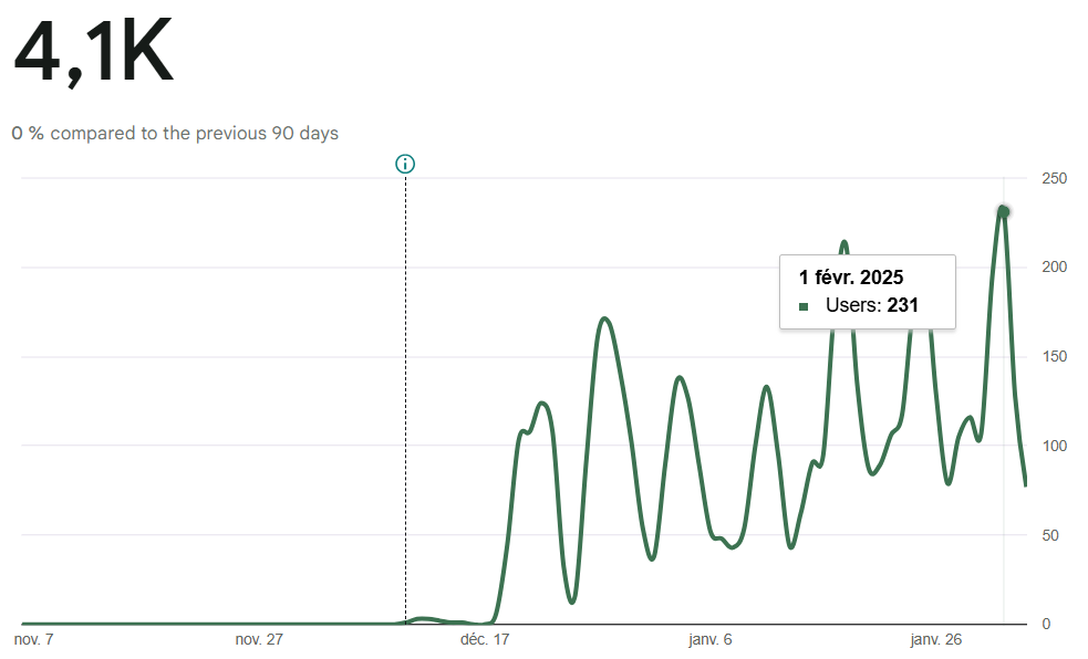 - Pics moyen journaliers observés à ~230 utilisateurs uniques/jour