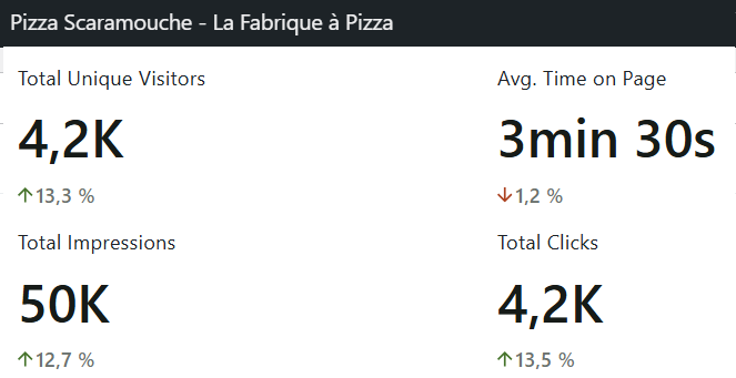 - Le site est passé de 0 à 1400 visiteurs organiques mensuels dès les 30 premiers jours et atteint actuellement plus de 4200 visiteurs uniques par mois et plus de 50.000 impressions mensuelles. Pas mal pour un restaurant de quartier !